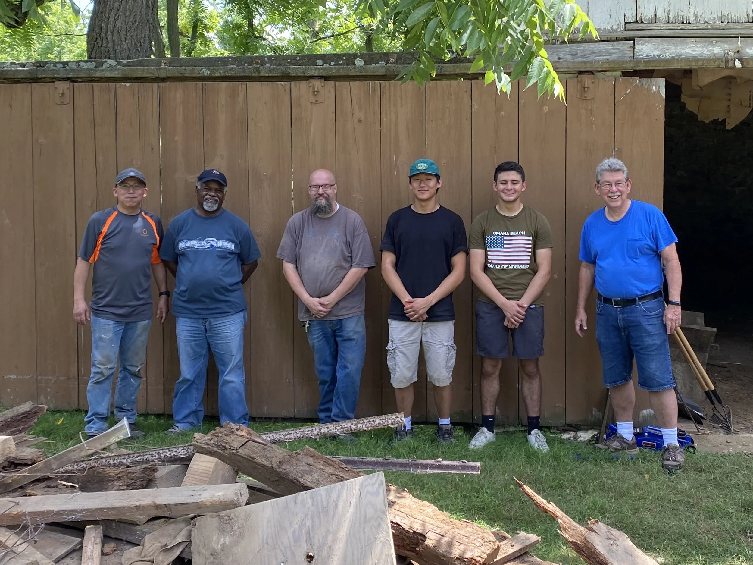 Photo, far Left: Eagle Scout Group 106 clean up effort, left to right: Alexander Jiang, commission member Rueben Garrett, Mr. Hughs, David Jiang, Mr. Fries, and commission chair Jeffrey Dore.